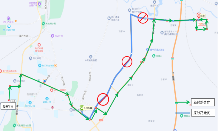 一.優(yōu)化調(diào)整33路公交線路走向 ◆首末站:楚天學(xué)?!郑ㄐ】的下繁保?/p> ◆首末班時(shí)間:6:50—17:45 ◆線路走向:響嶺路—運(yùn)動(dòng)公園路—象山大道—深圳大道—培公大道—荊和大道—深圳大道—荊東大道—興化三路—格林北路—興化四路—小康南路 ◆停靠站點(diǎn):楚天學(xué)校、雙喜街辦、運(yùn)動(dòng)公園路、萬達(dá)廣場(chǎng)、掇刀檢察院、掇刀法院、掇刀公安分局、南城明珠、中國(guó)人民銀行、市氣象局、襄荊高速、雙泉社區(qū)、人民萬福商貿(mào)城、人民一品花園、虎頭山、殯儀館、馮廟村、固潤(rùn)科技、東方雨虹、圣通石化、荊東消防、荊東大道興化五路口、潤(rùn)都制藥、興化三路西、興化三路中、興化三路盈德氣體、紐蘇萊、旺林、興化四路、小康南路北。 ◆取消原33路途經(jīng)荊和大道等路段站點(diǎn):荊和大道南、陽(yáng)光五路、陽(yáng)光四路、陽(yáng)光三路、化工產(chǎn)業(yè)園行政大樓。 二.優(yōu)化調(diào)整69路公交發(fā)班時(shí)間 ◆調(diào)整前 園博園東門發(fā)班時(shí)間:6:40、7:40、15:30、16:30、17:15 玲瓏輪胎發(fā)班時(shí)間:7:30、8:30、16:30、17:30、18:00 ◆調(diào)整后 園博園東門發(fā)班時(shí)間:6:40、7:20、15:30、16:30 玲瓏輪胎發(fā)班時(shí)間:7:30、8:20、12:20、16:20、17:30